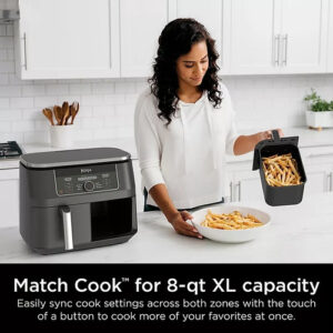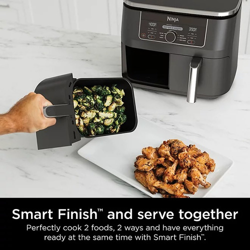 Cada zona de 4 litros tem seu próprio ventilador ciclônico e aquecedor rápido para permitir que você cozinhe 2 alimentos, 2 maneiras ao mesmo tempo tempo. Tecnologia DualZoneTM A tecnologia DualZoneTM apresenta Smart Finish, que sincroniza configurações de forma inteligente em cada zona para que os dois alimentos cozinhem com precisão e terminem juntos.