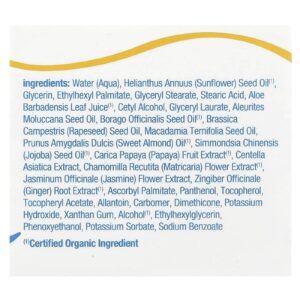 Água (aqua), óleo da semente de Helianthus annuus (girassol)(1), glicerina, ethylhexyl palmitate, monoestearato de glicerila, ácido esteárico, suco da folha de Aloe barbadensis(1), álcool cetílico, glyceryl laurate, óleo da semente de Aleurites moluccana, óleo da semente de Borago officinalis(1), óleo da semente de Brassica campestris (colza), óleo da semente de Macadamia ternifolia, óleo de Prunus amygdalis dulcis (amêndoa doce)(1), óleo da semente de Simmondsia chinensis (jojoba)(1), extrato da fruta de Carica papaya (mamão)(1), extrato de Centella asiatica, extrato da flor de Chamomilla recutita (matricária)(1), extrato da flor de Jasminum officinale (jasmim), extrato da raiz de Zingiber officinale (gengibre)(1), palmitato de ascorbila, pantenol, tocoferol, acetato de tocoferol, alantoína, carbômero, dimeticona, hidróxido de potássio, goma xantana, álcool(1), ethylhexylglycerin, fenoxietanol, sorbato de potássio, benzoato de sódio.
