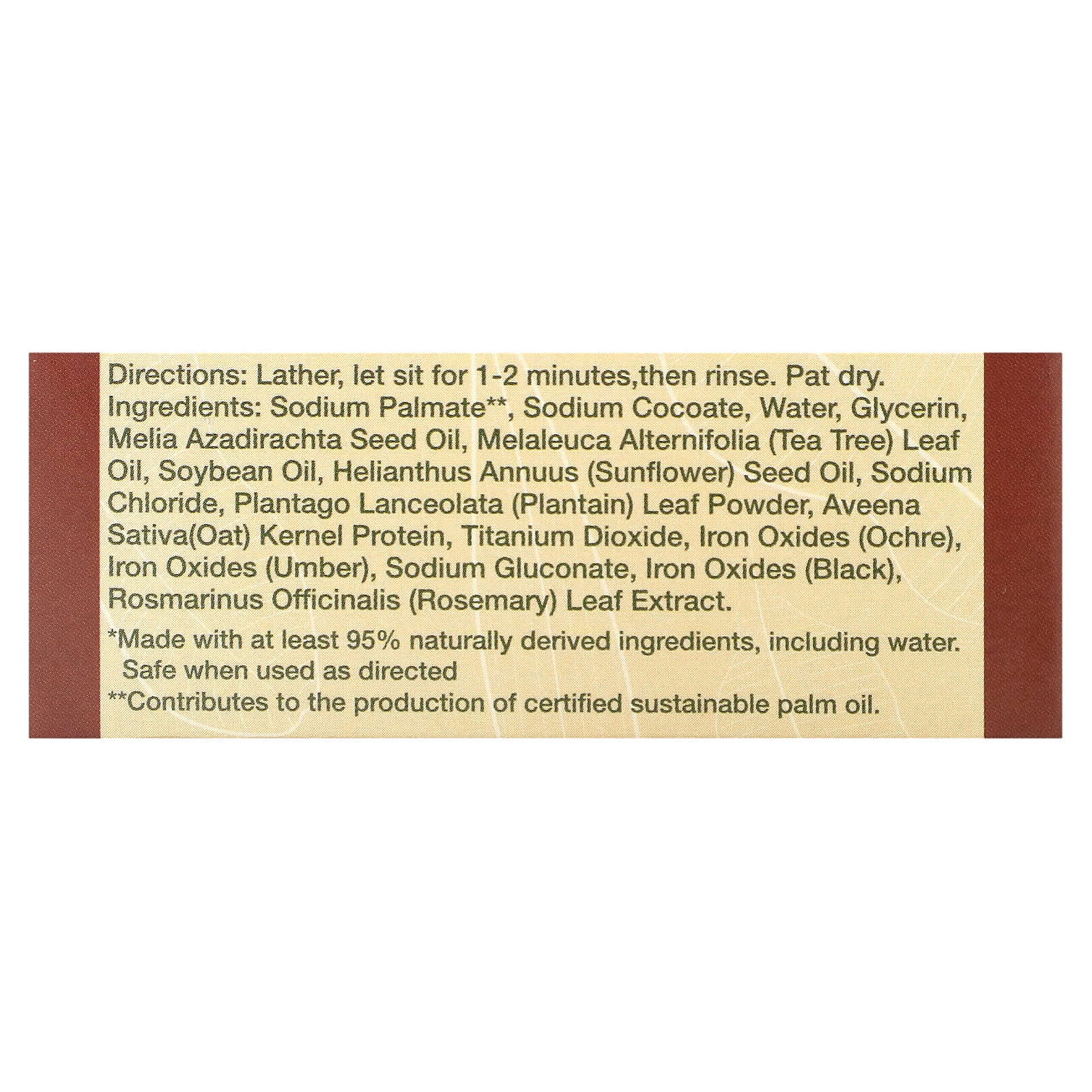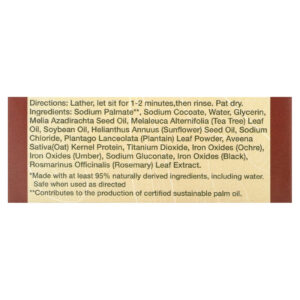 Palmato de sódio**, sodium cocoate, água, glicerina, óleo da semente de Melia azadirachta, óleo da folha de Melaleuca alternifolia (melaleuca), óleo de soja, óleo da semente de Helianthus annuus (girassol), cloreto de sódio, pó da folha de Plantago lanceolata (plátano), proteína do grão de Avena sativa (aveia), dióxido de titânio, óxidos de ferro (ocre), óxidos de ferro (umbre), gliconato de sódio, óxidos de ferro (preto), extrato da folha de Rosmarinus officinalis (alecrim).