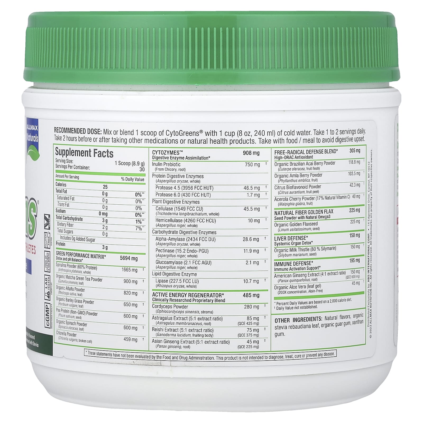 Misture ou misture 1 colher medidora de CytoGreens® com 1 xícara (240 ml, 8 oz) de água fria. Tome de 1 a 2 porções por dia. Tome 2 horas antes de tomar outros medicamentos ou produtos naturais para a saúde. Tome com alimentos/refeições para evitar distúrbios digestivos.