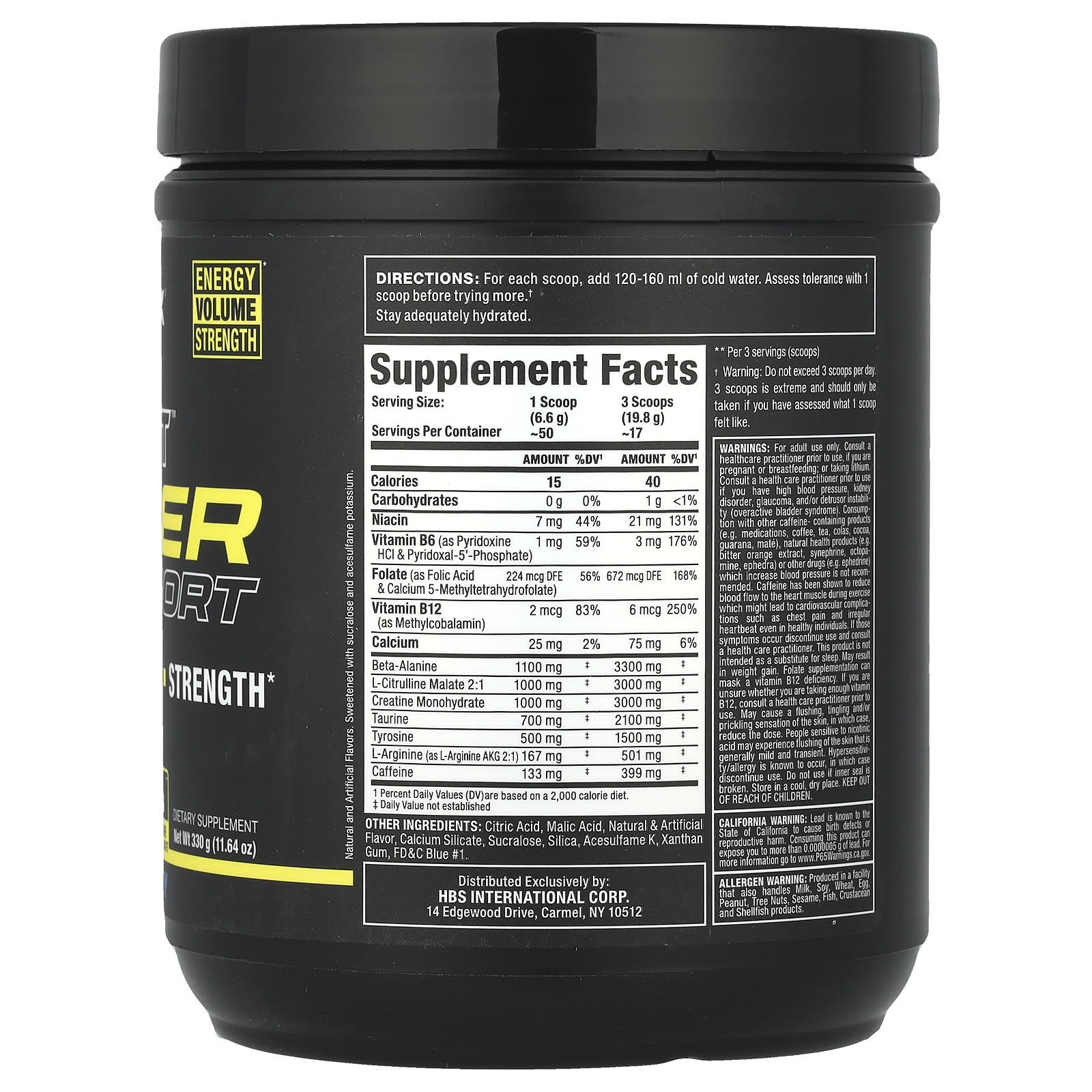 Somente para adultos. Consulte um profissional de saúde antes de usar o produto se estiver grávida ou amamentando; ou tomando lítio. Consulte um profissional de saúde antes de usar este produto se você tiver pressão sanguínea alta, distúrbio renal, glaucoma e/ou instabilidade da bexiga hiperativa. O consumo com outros produtos que contêm cafeína (por exemplo, medicamentos, café, chá, colas, cacau, guaraná, erva-mate), produtos naturais para a saúde (por exemplo, extrato de laranja amarga, sinefrina, octopamina, efedrina) ou outras medicamentos (por exemplo, efedrina) que aumentam pressão sanguínea não é recomendado. Foi demonstrado que a cafeína reduz o fluxo sanguíneo para o músculo cardíaco durante o exercício, o que pode levar a complicações cardiovasculares, como dor no peito e taquicardia, mesmo em indivíduos saudáveis. Em caso de esses sintomas, interrompa o uso e consulte um profissional de saúde. Este produto não se destina a substituir o sono. Pode resultar em ganho de peso. A suplementação com folato pode mascarar uma deficiência de vitamina B12. Se não tiver certeza se está ingerindo vitamina B12 suficiente, consulte um profissional de saúde antes de usar este produto. Pode causar rubor, formigamento e/ou sensação de formigamento na pele. Nesse caso, reduza a dose. Pessoas sensíveis ao ácido nicotínico podem sentir rubor na pele, que é geralmente leve e transitório. É conhecida a ocorrência de hipersensibilidade/alergia. Nesse caso, descontinue o uso. Não use se o lacre interno estiver rompido. Armazene em local fresco e seco. Mantenha fora do alcance de crianças.