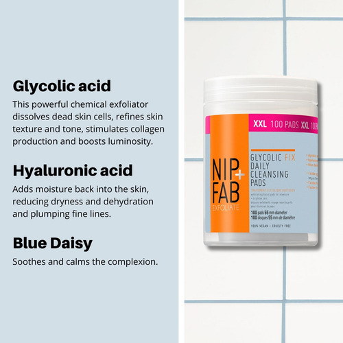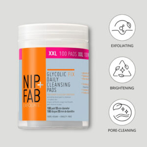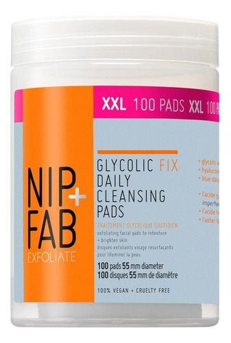 Almofadas de limpeza diária Nip + Fab Glycolic Acid Fix para rosto com ácido hialurônico, hamamélis, esfoliante facial e rejuvenescedor AHA para esfoliar, uniformizar o tom e clarear a pele, almofadas 100 XXL