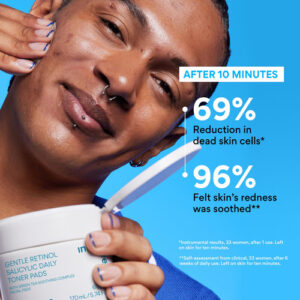 diários biodegradáveis com retinol e ácido salicílico suaves para acalmar a vermelhidão, hidratar e esfoliar suavemente a pele. –