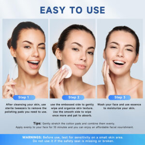 – Almofadas de polimento esfoliantes: adequadas para todos os tipos de pele, melhoram efetivamente sua pele visando pele opaca, oleosa, poros dilatados e manchas escuras, além de melhorar o tom da pele e textura. Fácil de usar. Basta limpar, usar a pinça para aplicar uma compressa, esfoliar suavemente com o lado texturizado, alisar com o lado plano, depois enxaguar e aplicar sua essência favorita para hidratação.