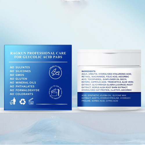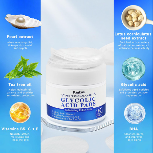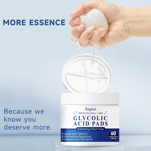 – As almofadas esfoliantes rejuvenescem sua pele: as almofadas de ácido glicólico da Ragkun removem suavemente a pele morta, deixando sua pele macia, suave e hidratada. A mistura única de ácidos glicólicos, ácidos salicílicos e ácidos hialurônicos rejuvenesce e equilibra o tom da pele. O uso consistente de compressas de recapeamento com ácido glicólico proporciona uma tez mais jovem, clara e brilhante que vale a pena ter.