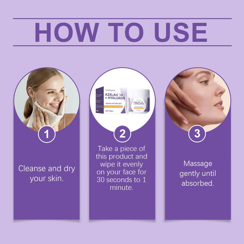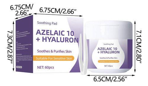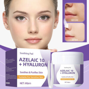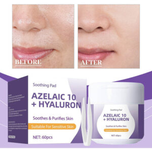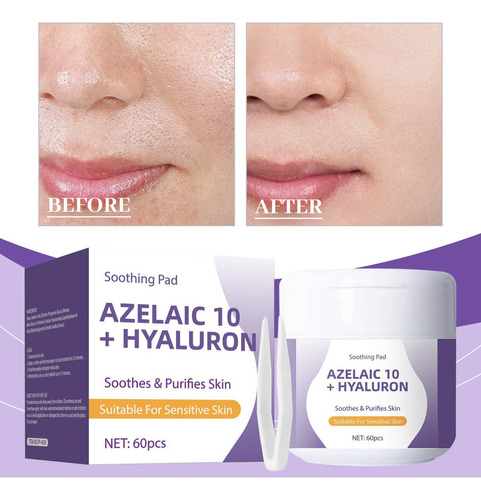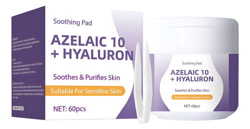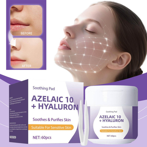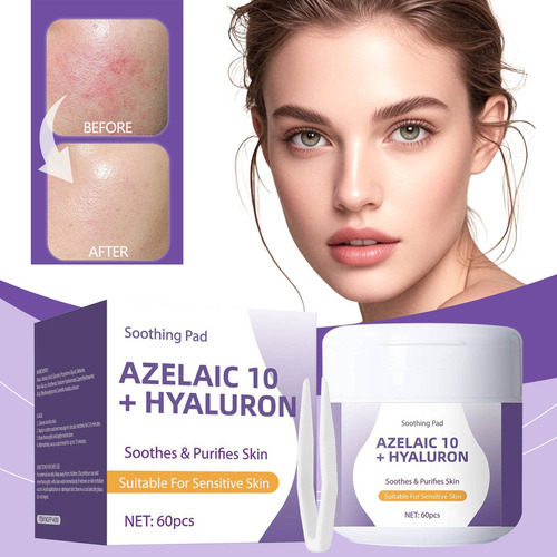 **Almofadas faciais calmantes com 10% de ácido azelaico e ácido hialurônico – 60 peças** Desfrute de uma rotina facial prática e eficaz com as almofadas faciais calmantes que combinam 10% de ácido azelaico e ácido hialurônico. Esses tônicos em forma de almofadas são especialmente projetados para reduzir a vermelhidão, suavizar a textura da pele e fornecer hidratação duradoura. Ideal para peles propensas a irritações, ajudam a recuperar o equilíbrio da pele e a manter o frescor diário. Cada compressa é impregnada com uma fórmula que inclui 7 extratos de centella asiatica e componentes calmantes, perfeitos para controlar o excesso de oleosidade causado pelo ressecamento, reduzir visivelmente a vermelhidão e melhorar a textura da pele. O material elástico exclusivo permite cobrir facilmente grandes áreas, como a testa ou o nariz, fornecendo cuidados concentrados em áreas específicas ou como máscara facial. Aprovadas dermatologicamente e livres de ingredientes irritantes, essas almofadas são seguras para uso diário em peles sensíveis. Sua aplicação simples permite que você os use todas as manhãs; basta colocá-los na área afetada por cinco minutos e limpar suavemente seguindo a textura facial. As almofadas faciais calmantes com ácido hialurônico e azelaico facilitam uma rotina de beleza rápida e eficaz, ideal para quem busca melhorar a aparência e a saúde da pele sem complicações. Perfeito para complementar qualquer regime facial em casa e manter a pele hidratada, calma e protegida todos os dias. Garantia do vendedor: 1 meses