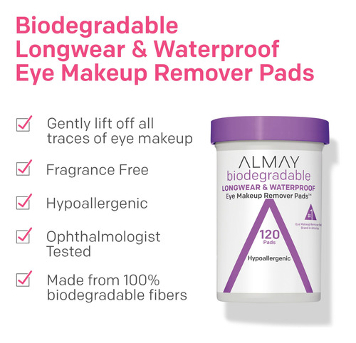 Almofadas removedoras de maquiagem biodegradáveis Almay, duradouras e impermeáveis, hipoalergênicas, sem perfume, testadas por dermatologistas e oftalmologistas, 120 unidades — BIODEGRADÁVEIS: o mesmo cuidado para olhos e pele sensíveis, agora em uma almofada biodegradável. Adora nossas almofadas removedoras de maquiagem impermeáveis e de longa duração? Agora com um novo visual e feito com almofadas biodegradáveis! – Remoção de maquiagem de olhos à prova d’água e de longa duração: limpe todos os traços de maquiagem dos olhos com um rímel impermeável e fácil de usar; sem necessidade de enxágue – Limpeza suave e eficaz: nossos removedores de maquiagem para os olhos são tão suaves para a delicada área dos olhos quanto eficazes para limpar sem puxar ou puxar – FORMULADOS SEM: parabenos, ftalatos, SLS, DMDM, hidantoína, formaldeídos, e triclosan — adequado para olhos sensíveis: como parte da promessa da Almay, este produto é hipoalergênico e testado por oftalmologistas, além de limpo, livre de crueldade e perfumado gratuito; também é adequado para olhos sensíveis e usuários de lentes de contato