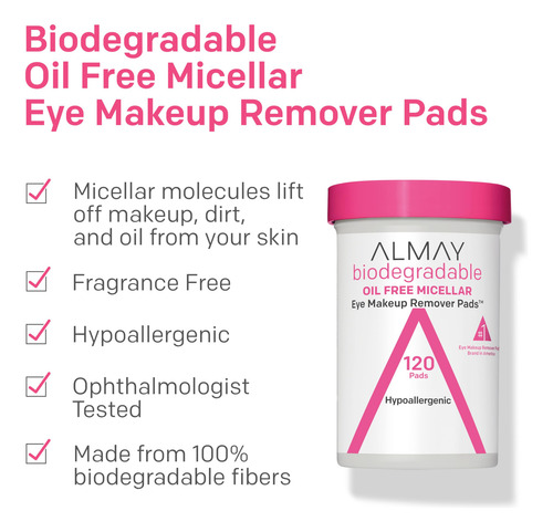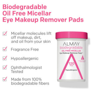 Almofadas removedoras de maquiagem biodegradáveis Almay, micelares suaves, hipoalergênicas, sem perfume, testadas por dermatologistas e oftalmologistas, 80 unidades (pacote com 1) — NOVAS E APRIMORADAS: O mesmo cuidado para olhos e pele sensíveis, agora em uma almofada biodegradável. Adora nossas almofadas removedoras de maquiagem sem óleo? Agora com um novo visual e feito com almofadas biodegradáveis! – REMOÇÃO SUAVE DA MAQUIAGEM MICELAR DOS OLHOS: as almofadas de limpeza micelar ultramacias removem facilmente todos os traços de maquiagem dos olhos sem puxar ou puxar a delicada área dos olhos – Sem óleo e fáceis: enquanto as moléculas micelares removem a maquiagem dos olhos, a solução sem óleo não deixa resíduos gordurosos e não requer enxágue, tornando essas almofadas perfeitas para limpeza em qualquer lugar – FORMULADAS SEM: parabenos, ftalatos, SLS, DMDM Hidantoína, formaldeídos e triclosan – ADEQUADOS PARA OLHOS SENSÍVEIS: Como parte da promessa da Almay, este produto é hipoalergênico e oftalmologista testado e limpo, livre de crueldade e sem fragrância; também é adequado para olhos sensíveis e usuários de lentes de contato