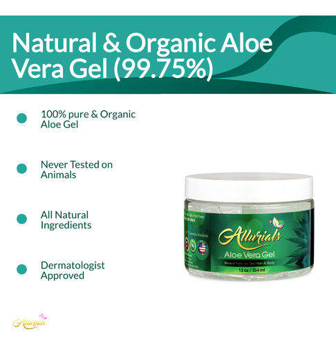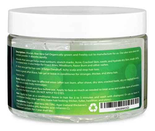 Apresentando o gel de aloe vera da mais alta qualidade que revolucionará sua rotina de cuidados com a pele. Cultivada com orgulho no sul do Texas, nossa babosa é da mais alta qualidade e garante o máximo de frescor. Você pode confiar que está usando um produto que atende aos mais altos padrões. Usamos folhas de aloe reais recém-cortadas, não em pó, o que o torna um dos géis mais puros e fortes do mercado. Descubra as maravilhas da planta milagrosa da natureza com o gel de aloe vera Allurilas. Ele alivia queimaduras solares, trata cortes, elimina erupções cutâneas e acalma as queimaduras causadas pelo barbear. É uma solução versátil para todas as necessidades da sua pele. Faça do nosso gel puro de aloe vera parte de sua rotina diária. Este gel transparente e ligeiramente mais fino é excelente para tratar o rosto, a pele e o cabelo. O uso regular deixará sua pele macia, macia e com um brilho saudável. Nosso gel é 100% orgânico e prensado a frio. Experimente a maior potência de vitaminas, minerais e proteínas essenciais com o gel de aloe vera Allurilas. Protege naturalmente contra agentes ambientais indesejados e fornece uma consistência fluida e sedosa para uma aplicação mais satisfatória. Você vai adorar a sensação na pele e no cabelo, nunca fica pegajoso ou oleoso. Nutra e suavize sua pele com os ricos nutrientes, vitaminas e minerais encontrados no aloe vera. Controlamos todos os aspectos de nossas fazendas orgânicas, garantindo as plantas mais felizes e biologicamente ativas. Colhido e processado em questão de horas, nosso gel captura os níveis mais altos dos 230 nutrientes naturais encontrados no aloe vera. Estamos comprometidos com o meio ambiente, e é por isso que nosso gel puro de aloe vera é ecológico e livre de crueldade. Diga adeus aos géis de aloe vera diluídos. O gel de aloe vera Allurilas é feito de aloe vera 100% puro prensado a frio, com menos de 1% de outros ingredientes que protegem a pele para melhorar sua qualidade. Os humanos aproveitam a planta milagrosa da natureza há milhares de anos e agora você pode experimentar seus benefícios com o gel de aloe vera Allurilas. – Extrato de aloe vera 100% puro: nosso gel orgânico de aloe vera é formulado com extrato de aloe vera 100% puro que é cuidadosamente processado e prensado a frio para reter seus nutrientes e vitaminas essenciais. As propriedades curativas e nutritivas suaves do aloe vera são totalmente preservadas em nosso gel de aloe vera para que você possa obter os benefícios à saúde desta incrível planta de interior. – Nosso gel orgânico de aloe vera é perfeito para todos os seus problemas de pele e cabelo. Ele contém uma grande quantidade de nutrientes benéficos, como vitaminas A, C e E, e antioxidantes que ajudam a acalmar e suavizar a pele. As enzimas do nosso gel de aloe vera também ajudam a eliminar as células mortas da pele e a desobstruir os poros, deixando a pele suave, macia e fresca. – Além de seus inúmeros benefícios para a pele, o gel de aloe vera também é ótimo para cabelos. Ele contém enzimas que ajudam a aliviar a irritação do couro cabeludo e eliminar a caspa, deixando o cabelo saudável e brilhante. – Nosso gel puro de aloe vera é perfeito para todos os tipos de pele, pois não contém produtos químicos agressivos, como corantes, conservantes e sulfatos, que podem causar irritação e danos à pele. Também é livre de crueldade e ecologicamente correto, o que o torna a escolha perfeita para quem se preocupa com o planeta e seus habitantes. – Suaviza e repara a pele – Nosso gel puro de aloe vera é um gel transparente e um pouco mais fino, um excelente tratamento diário para o rosto, pele e cabelos. O uso regular acalma a pele deixando-a macia e flexível com um brilho saudável.