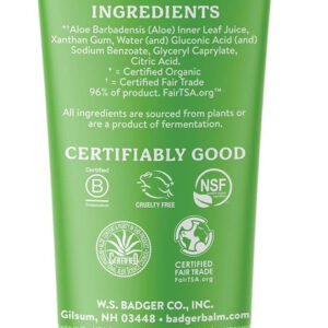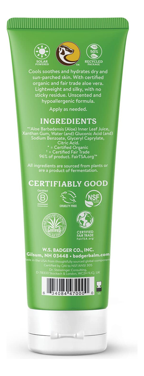 Acalma e hidrata a pele sedenta e ressecada pelo sol. Leve e de fácil absorção, sem resíduos pegajosos, o gel puro de aloe vera para alívio de queimaduras solares proporciona o alívio perfeito após os dias ensolarados de verão, deixando a pele fresca e revigorada. Vegano, livre de crueldade, hipoalergênico e sem perfume. Feito com suco de aloe 96% puro, orgânico e de comércio justo, livre de parabenos, sulfatos, ftalatos, cores, fragrâncias ou corantes. É o mais próximo possível de quebrar uma folha de uma planta de babosa. Aloe, uma planta suculenta do deserto, tem sido usada tradicionalmente há séculos para acalmar e reidratar a pele ressecada. Com boas propriedades antioxidantes, também foi demonstrado que o Aloe ajuda no processo natural do corpo de curar e reparar a pele danificada pelo sol. Adoramos o nome comum desta planta Varinha de Deus. Ingredientes do gel de Aloe Vera: Aloe orgânico, goma xantana (de milho não transgênico), água (e) ácido glucônico (e) benzoato de sódio (de óleo de cássia e fontes naturais de frutose), caprilato de glicerila (de material vegetal não transgênico), ácido cítrico (de milho não transgênico). = Comércio justo certificado. 96% do produto. – ACALMA E ESFRIA: Alivia a secagem, pele irritada e queimada pelo sol. Leve, de fácil absorção, sem resíduos pegajosos ou oleosos. Não comedogênico, hipoalergênico e ótimo para peles sensíveis ou propensas a acne – HIDRATA E HIDRATA: Usado há séculos por suas propriedades terapêuticas hidratantes e antioxidantes. Deixa sua pele, rosto, cabelo ou couro cabeludo hidratados e revigorados – INGREDIENTES ORGÂNICOS LIMPOS: Feitos com suco de aloe 96% puro, orgânico e de comércio justo. O mais perto possível de quebrar uma folha de uma planta de babosa – CERTIFICADAMENTE BOM: certificado como orgânico e não transgênico pela NSF, Fair Trade pela TSA, Cruelty Free pela Leaping Bunny, sem glúten pela GFCO e Pure Aloe pelo IASC. Badger é uma babosa sustentável certificada pela BCorp: este gel de aloe orgânico e de comércio justo vem em tubos 50% reciclados e é feito com 100% de energia solar nos EUA por uma empresa familiar de propriedade e administrada por mulheres