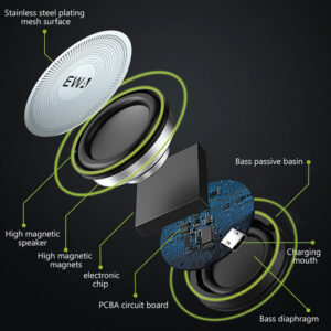 O minifalante é convenientemente pequeno, mas capaz de emitir som cristalino com graves impressionantes e volume que preenche a sala por meio de um driver de alto desempenho e um subwoofer passivo. Pequenos, mas poderosos alto-falantes Bluetooth.