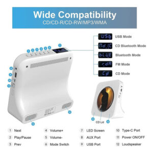 O CD player portátil com alto-falantes HIFI é multifuncional: leitura de CD, conexão Bluetooth (entrada e saída), porta AUX (entrada e saída de linha), disco U, rádio FM, despertador Dicas: 2 x alto-falantes Bluetooth Hi-Fi integrados Receptor Bluetooth integrado de 5 W que pode se conectar a dispositivos habilitados para Bluetooth, como telefones celulares ou tablets.)