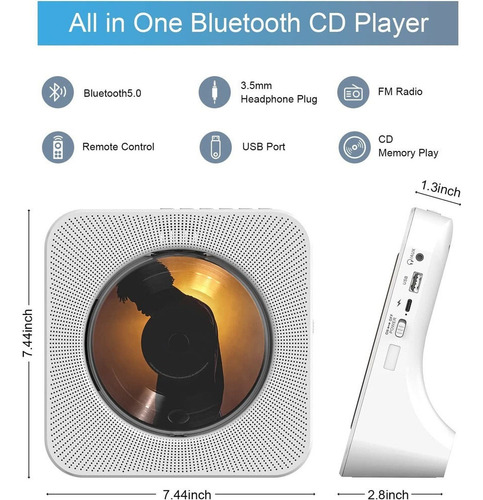 O CD player Bluetooth suporta 5 formatos compatíveis: CD, CD-R, CD-RW, MP3, WMA. E suporta reprodução de 5 loops: Repetir AB, Repetir Um, Repetir Todos, Aleatório, Normal. Suporte despertador 30-180m.