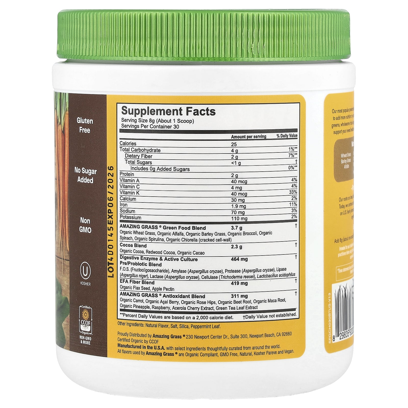 Todos os sabores usados pela Amazing Grass® são orgânicos, Sem OGM, natural, kosher parve e vegano.