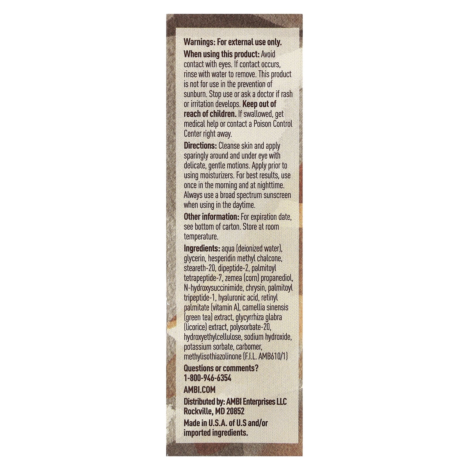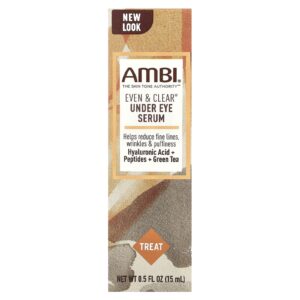 O SÉRUM AMBI Even & Clear Under EYE age para restaurar e manter sua aparência jovem com uma fórmula antienvelhecimento patenteada que utiliza Ácido Hialurônico, Peptídeos, Chá Verde e outros ingredientes naturais. Quando usado conforme as instruções, este complexo nutritivo reduz linhas de expressão, rugas e inchaço, ao mesmo tempo que restaura a elasticidade da pele e o tom da pele.