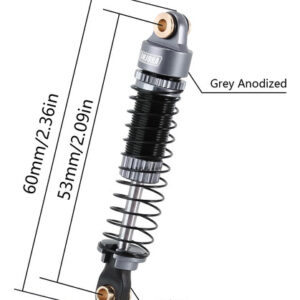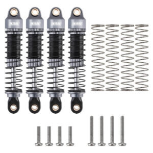 Especificações: Número da peça: 4M-24 Cor: cinza Quantidade: 4 unidades Comprimento total: 60,3 mm (2,37 pol.) Comprimento de furo a furo: 53 mm (2,09 pol.) Curso máximo: 13,5 mm (0,53 pol.) Comprimento da mola: 43 mm (1,69 pol.) Espessura da mola: 0,45 mm 0,5 mm Cada peso: 6 g (0,21 onças) – Duas taxas de mola incluídas (0,45 0,5 mm), cada mola 43 mm de comprimento, podem ser ajustados de acordo com o chassi. – Corpos de choque de alumínio usinados CNC, alta proteção e longa durabilidade. – Extremidade inferior da haste de nylon, design telescópico para deslocamento máximo (13,5 mm). – Corpos de choque roscados para pré-carga rápida, suave e excelente amortecimento efeito. – Compatível com TRX4M 1/18 Defender, Bronco, K10 High Trail, F150 e TRX4MT RC Crawler Upgrade. Nota: óleo de amortecedor (não incluído), detalhes de instalação na Figura 6.