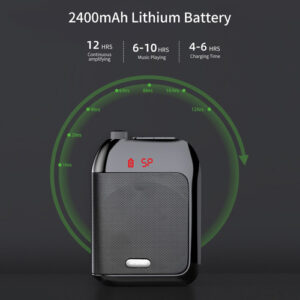 Bateria recarregável integrada de 2400 mAh, amplificação sonora de longa duração de até 12 horas. Capacidade de reprodução de música por até 6 a 10 horas.