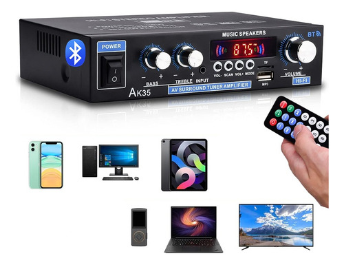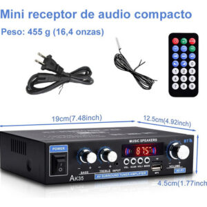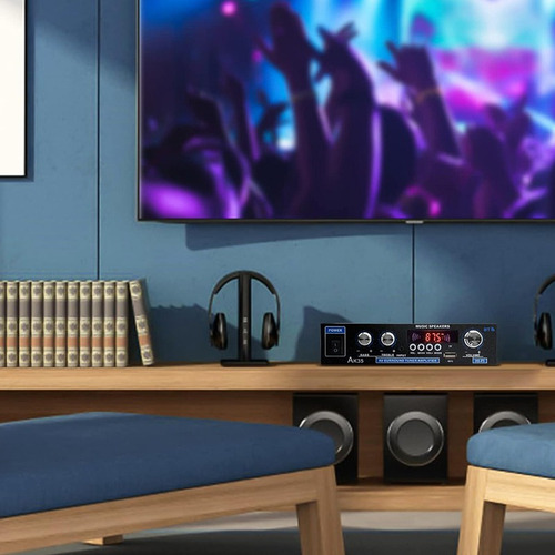 Esse amplificador estéreo HiFi tem desempenho excepcional, amplificador digital de dois canais, pico de 300 W + 300 W, potência nominal de 30 W + 30 W, adequado para uma ampla gama de fontes de alimentação; conectividade Bluetooth 5.0 conveniente e de alta qualidade integrada, suporte para controle remoto infravermelho com entrada de áudio multimodo, controle remoto universal compatível e controle remoto, caixa de liga de alumínio, indutores de filtragem para proteger a qualidade do som, potência de saída de dois canais pode ser considerável, adequada para sistemas de áudio de várias classes.