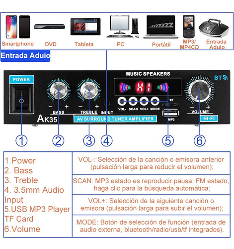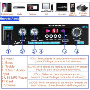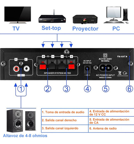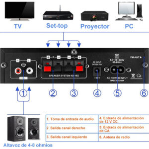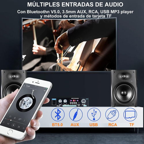 Bluetooth, AUX, RCA, USB, MP3 player e cartão TF, vários métodos de entrada de áudio e modo FM. A tela de LED de alta resolução mostra vários modos. Facilmente compatível com smartphones, tablets, PCs, TVs, MP3, MP4, DVD, VCD e muito mais.