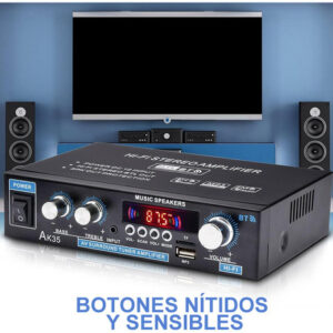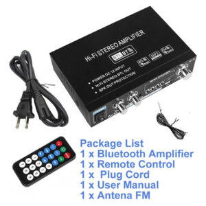 Amplificador de áudio Bluetooth de dois canais com potência de saída máxima de 2 x 300 W para alimentar alto-falantes de 4 a 8 ohms. Com antena para melhor sinal e forte capacidade anti-interferência.