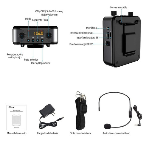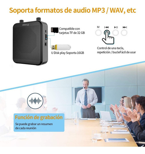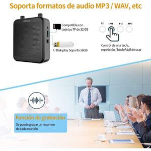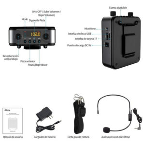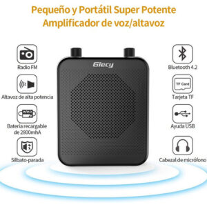 Este mini amplificador de voz bluetooth com microfone, mas também um MP3 player, que suporta cartão TF (Micro SD Max: 64GB) e U-Disk, o amplificador de voz com fones de ouvido também pode atuar como alto-falante, pode repetir melodias individuais, tocar todas as músicas faixas em um loop.