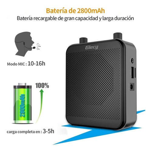O amplificador de voz recarregável possui uma bateria de lítio embutida de 7,4V/2800mAh. Alta taxa de segurança e bateria de longa duração. Você pode usá-lo por 14 a 17 horas (modo MIC) e 7 a 11 horas (modo música) com a bateria totalmente carregada. O amplificador leva entre 3 e 5 horas para carregar.