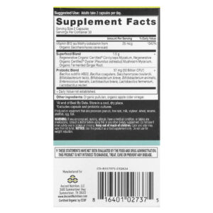 | Mistura de Superalimentos Micélio de Cordyceps Regenerative Organic Certified®, Micélio de Cogumelo de Ostra (Pleurotus ostreatus) Regenerative Organic Certified®, Raiz de Gengibre Fermentado Orgânico. |