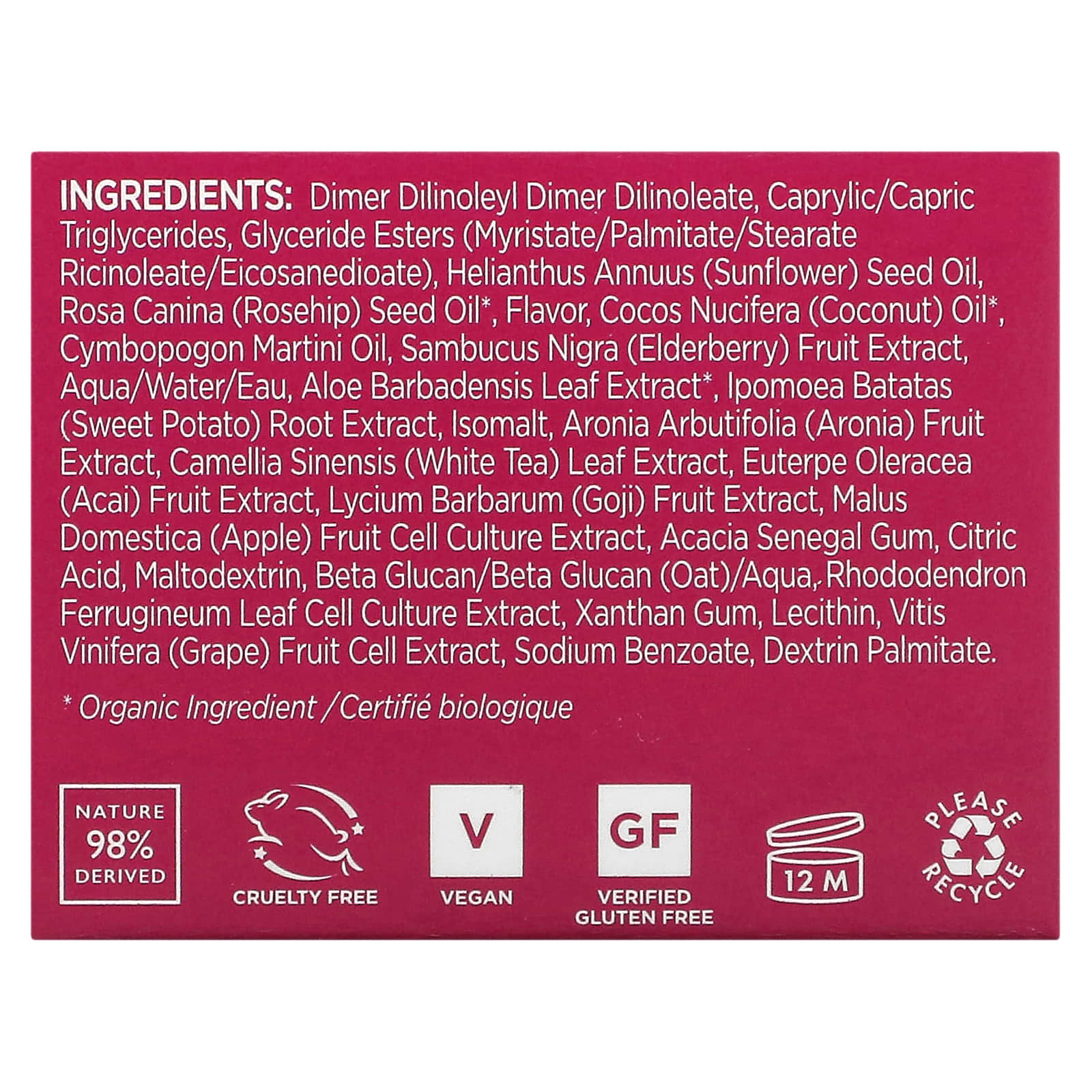 Dímero dilinoleyl dímero dilinoleato, caprylic/capric triglycerides, ésteres de glicerídeo (miristato / palmitato / estearato ricinoleato / eicosanedioato), óleo da semente de Helianthus annuus (girassol), óleo da semente de rosa canina (rosa mosqueta) *, sabores, óleo de cocos nucifera (coco) *, óleo de cymbopogon martini, extrato da fruta de sambucus nigra (sabugueiro), água, extrato da folha de Aloe barbadensis *, extrato de raiz de ipomea batatas (batata-doce), isomalte, extrato do fruto de Aronia arbutifolia (aronia), extrato da folha de Camellia sinensis (chá branco), extrato da fruta de Euterpe oleracea (açaí), extrato da fruta Lycium barbarum (goji), extrato da cultura de células da fruta de Malus domestica (maçã), goma de acácia-do-senegal, ácido cítrico, maltodextrina, betaglucano / betaglucano (aveia) / água, extrato da cultura de células da folha de Rhododendron ferrugineum, goma xantana, lecitina, extrato de células da fruta Vitis vinifera (uva), benzoato de sódio, palmitato de dextrina.