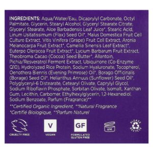 Suco de folhas de Aloe barbedensis*, água purificada (aqua), carbonato de dicaprilil, álcool estearílico, óleo de semente linum usitatissimum (linho)*, álcool cetílico, palmitato de etil-hexil, estearato de gliceril, células-tronco de frutas (malus domestica, solar vitus) e complexo bioativo 8 de bagas*, manteiga de sementes de theobroma cacau (cacau)*, alantoína, resveratrol, ubiquinona (CoQ10), proteína de arroz hidrolisada, hialuronato de sódio, extrato de frutos de lycium barbarum (goji), extrato de broto de fagus sylvatica (faia), tocoferol, fosfato de magnésio ascorbil (vitamina C), óleo de semente de borago officinalis (borragem)*, óleo de fruta persea gratissima (abacate)*, óleo de fruta rosa canina (rosa mosqueta)*, óleo de oenothera beinnis (prímula)*, esqualano de azeitona, extrato de folhas de camélia sinensis (chá branco)*†, aspalathus linearis (roobios)*†, extrato de flor de hibiscus sabdariffa*†, riboflavina, álcool fenetílico, etilhexilglicerina, isolados de baunilha, extrato de symphytum officinale (confrei).