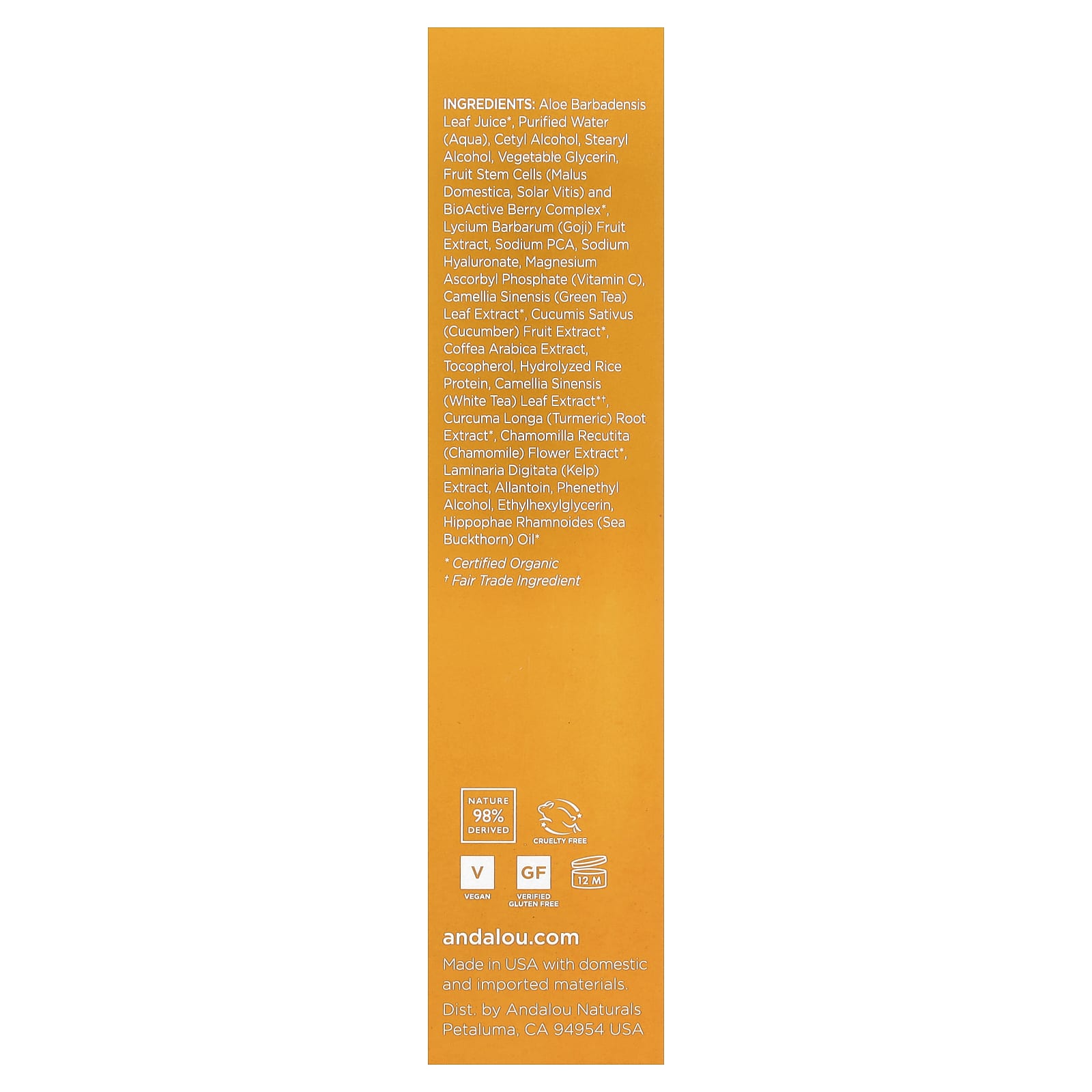 Suco da folha de Aloe barbadensis*, água purificada (aqua), álcool cetílico, álcool estearílico, glicerina vegetal, células-tronco de frutas (Malus domestica, solar vitis) e complexo bioativo de frutos silvestres*, extrato da fruta de Lycium barbarum (goji), pidolato de sódio, hialuronato de sódio, magnesium ascorbyl phosphate (vitamina C), extrato da folha de Camellia sinensis (chá verde)*, extrato do fruto de Cucumis sativus (pepino)*, extrato de Coffea arabica, tocoferol, proteína de arroz hidrolisada, extrato da folha de Camellia sinensis (chá branco)* †, extrato da raiz de Curcuma longa (cúrcuma)*, extrato da flor de Chamomilla recutita (camomila)*, extrato de Laminaria digitata (alga castanha), alantoína, álcool fenetílico, ethylhexylglycerin, óleo de Hippophae rhamnoides (espinheiro-marítimo)*