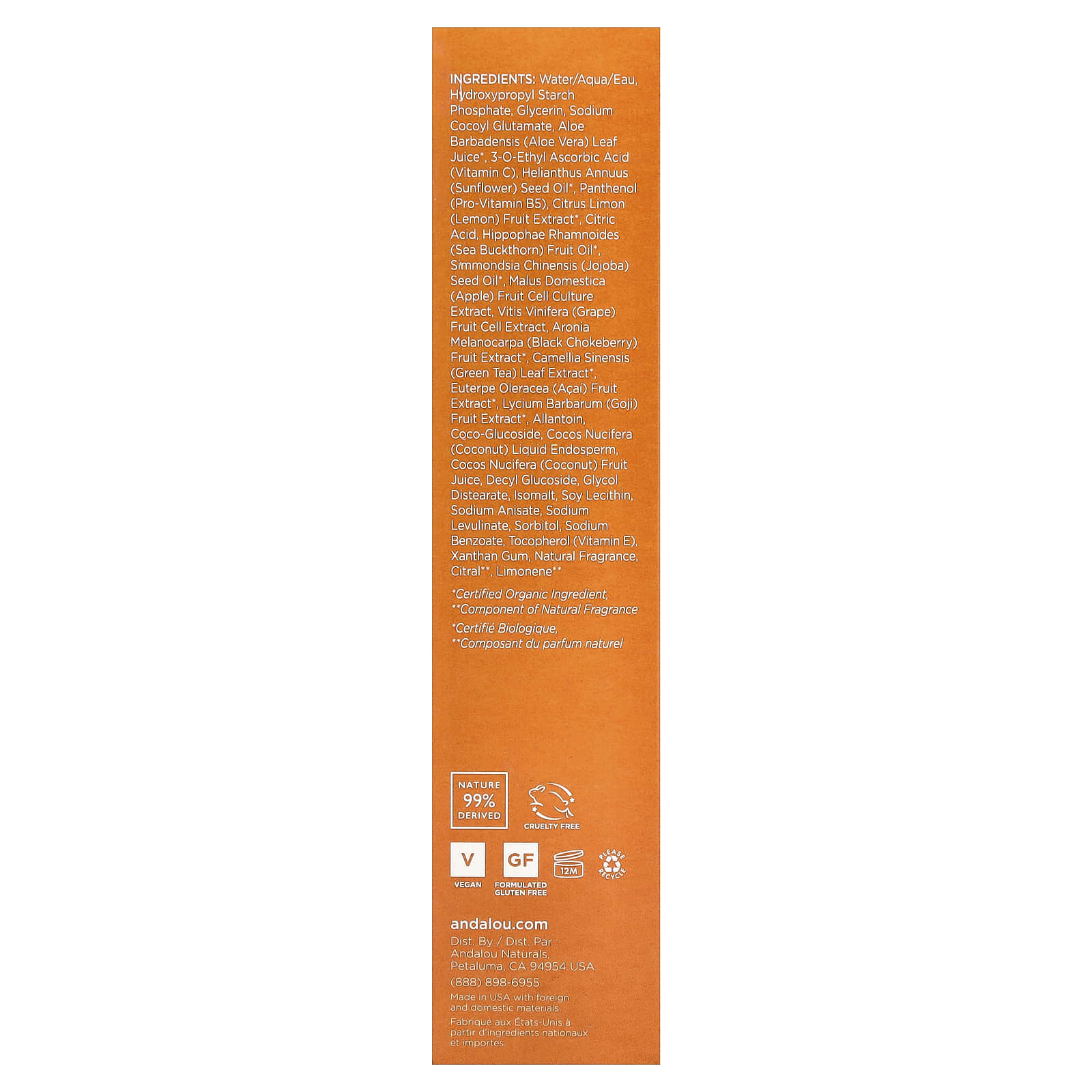 Água, fosfato de hidroxipropildiamido, glicerina, sodium cocoyl glutamate, suco da folha de Aloe barbadensis (babosa)*, Ácido 3-o-etil ascórbico (vitamina C), óleo da semente de Helianthus annuus (girassol)*, pantenol (provitamina B5), extrato da fruta de Citrus limon (limão)*, ácido cítrico, óleo da fruta de Hippophae rhamnoides (espinheiro marítimo)*, óleo da semente de Simmondsia chinensis (jojoba)*, extrato da cultura de células da fruta de Malus domestica (maçã), extrato de células da fruta Vitis vinifera (uva), extrato da fruta de Arônia melanocarpa (berry)*, extrato da folha de Camellia sinensis (chá verde)*, extrato da fruta de Euterpe oleracea (açaí)*, extrato da fruta de Lycium barbarum (goji)*, alantoína, coco-glucoside, endosperma líquido de Cocos nucifera (coco), suco da fruta de Cocos nucifera (coco), decyl glucoside, diestearato de etilenoglicol, isomalte, lecitina de soja, anisato de sódio, levulinato de sódio, sorbitol, benzoato de sódio, tocoferol (vitamina E), goma xantana, fragrância natural, citral**, limoneno**.