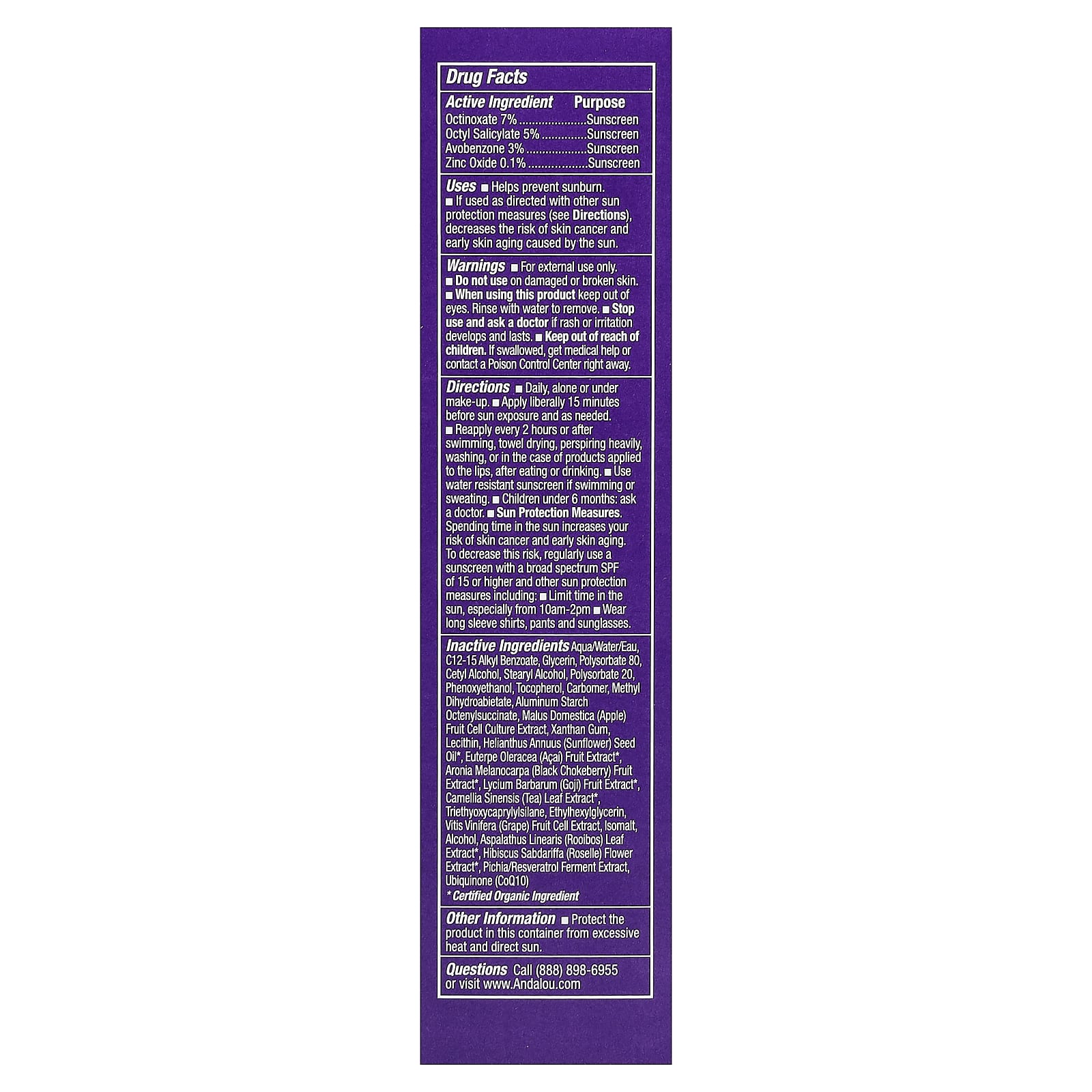 | Ingredientes Inativos: Água, c12-15 alkyl benzoate, glicerina, polisorbato 80, álcool cetílico, álcool estearílico, polisorbato 20, fenoxietanol, tocoferol, carbômero, methyl dihydroabietate, amido de alumínio octenylsuccinate, extrato da cultura de células da fruta Malus domestica (maçã), goma xantana, lecitina, óleo da semente de Helianthus annuus (girassol)*, extrato da fruta de Euterpe oleracea (açaí)*, extrato da fruta de Aronia melanocarpa (chokeberry preto)*, extrato da fruta de Lycium barbarum (goji)*, extrato da folha de Camellia sinensis (chá)*, triethyoxycaprylylsilane, ethylhexylglycerin, extrato de células da fruta Vitis vinifera (uva), isomalto, álcool, extrato da folha de Aspalathus linearis (rooibos)*, extrato da flor de Hibiscus sabdariffa (roselle)*, extrato da fermentação de pichia/resveratrol, ubiquinona (coq10). *Ingrediente Orgânico Certificado |