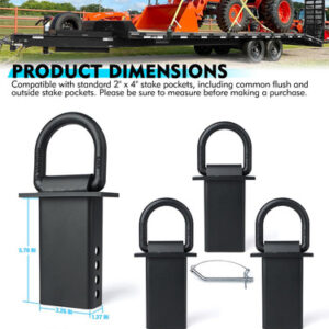 Com uma força máxima de ruptura de 18.000 libras e um limite de carga de trabalho de 5.400 libras, nossos anéis D de bolso de estaca estão prontos para ações pesadas. Conjuntos de parafusos e conectores incluídos para uma fixação segura em seu caminhão ou trailer. – Resistência incomparável: com um impressionante limite de carga de trabalho de 5.400 libras por anel D de bolso de estaca de 5/8", com uma capacidade combinada de 18.000 libras, garante que suas mercadorias sejam carregadas com segurança no veículo. – Acessório de carga versátil: os anéis D não servem apenas para exibição. Eles servem como pontos de fixação seguros para vários ganchos e acessórios finais, expandindo suas opções de proteção de carga. – Construção premium em aço sólido: construída de forma resistente com construção em aço sólido, nosso anel D com bolso de estaca pode manuseie cargas pesadas com facilidade. Revestido com acabamento preto resistente à corrosão, ele resiste às intempéries, garantindo longevidade e confiabilidade. – Precisão no posicionamento: obtenha o ajuste perfeito para sua carga atual com nossos anéis D de bolso de estaca. Cada um vem com pino de engate, completo com um contrapino de travamento e 4 orifícios para ajustes precisos de altura. – Feito sob medida para sacos de estaca: projetado para caber perfeitamente no bolso padrão de 2 x 4 estacas S. Versatilidade no seu melhor, apenas certifique-se de medir antes de comprar para garantir um ajuste confortável.