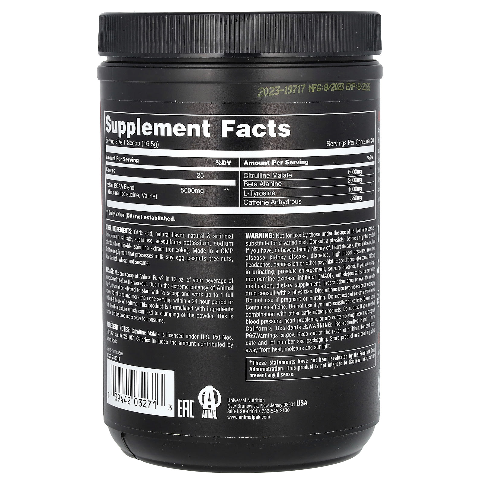 Animal Fury® é o pré-treino definitivo para quem quer superar os objetivos de condicionamento físico e liberar o verdadeiro potencial. Ele foi meticulosamente projetado para aumentar a energia e o foco, além de proporcionar desempenho e estímulo poderosos como nunca antes. Cada colher medidora ajuda você a se manter motivado e determinado durante todo o treino.