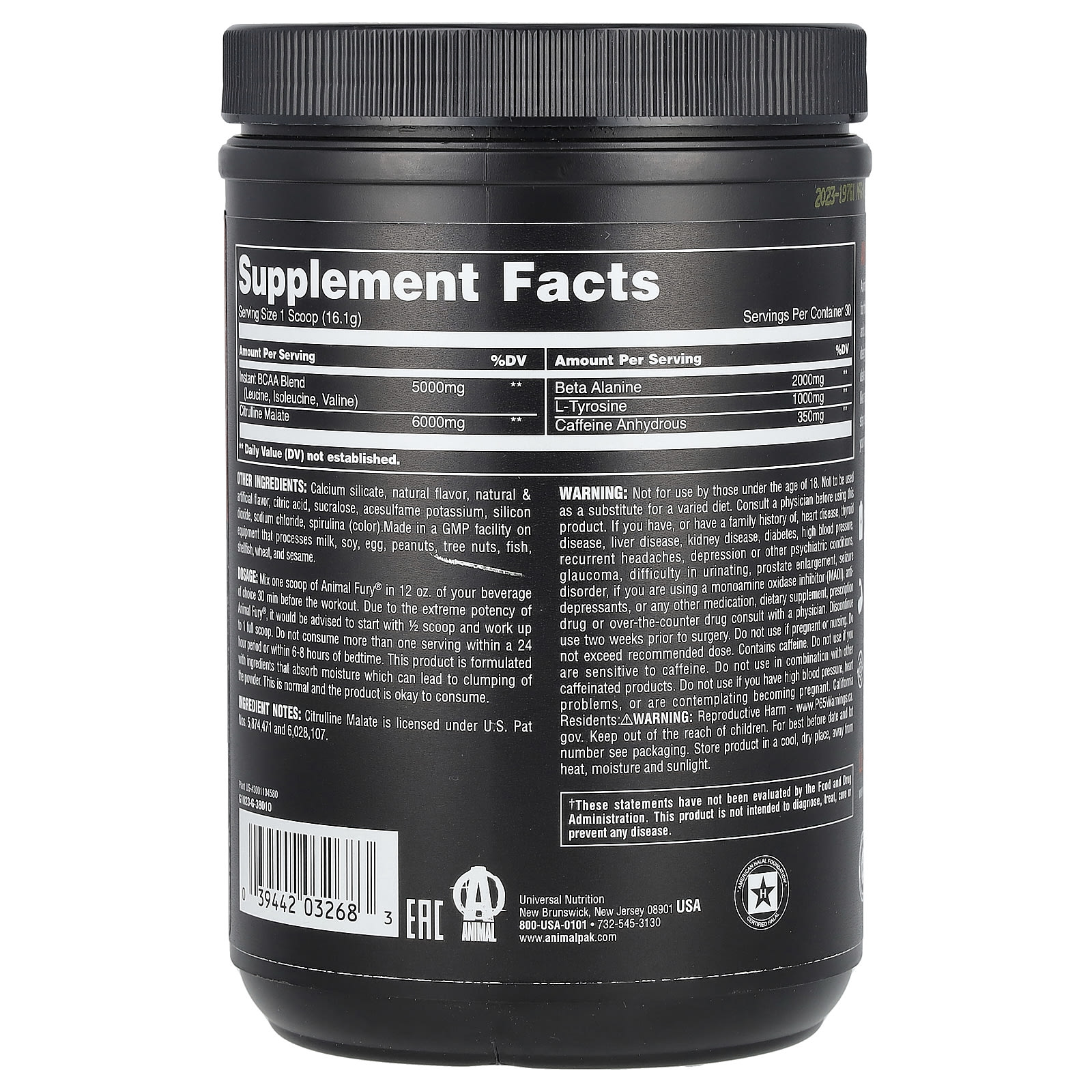 Animal Fury® é o pré-treino definitivo para quem quer superar seus objetivos de condicionamento físico e explorar o seu verdadeiro potencial. Elaborado meticulosamente para aumentar a energia e o foco, além de proporcionar desempenho e estímulo poderosos como você nunca vivenciou antes. Cada colher medidora ajuda a manter a motivação e a determinação durante todo o treino.