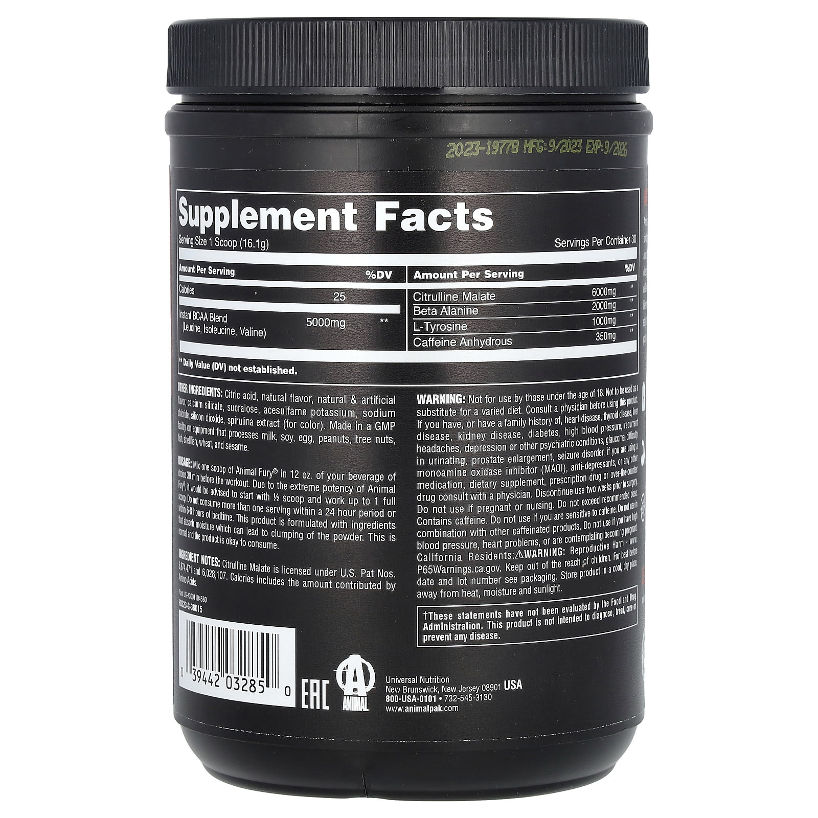 Um barril de pólvora de poder, Animal Fury se destina a trazer a dor. Uma fórmula pré-treino concentrada carregada com dosagens eficazes dos ingredientes mais impactantes, Animal Fury foi projetado para atender aos desafios das demandas de treinamento mais difíceis. No momento de levantar o peso mais pesado e fazer o chão da sala de musculação tremer, Animal Fury acende o pavio do barril de pólvora.