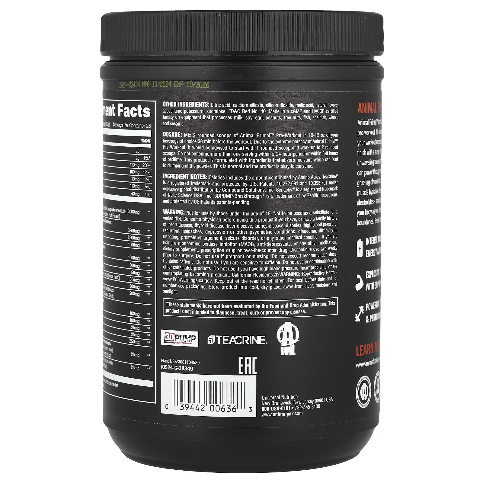 Dosagem: Misture 2 colheres medidoras de Pré-treino Animal Primal™ em 10–12 oz da bebida de sua escolha 30 minutos antes do treino. Devido à extrema potência do Pré-treino Animal Primal™, é recomendável começar com 1 colher medidora rasa e aumentar para 2 colheres medidoras rasas. Não consuma mais de uma porção em um período de 24 horas nem de 6 a 8 horas antes de deitar. Este produto é formulado com ingredientes que absorvem a umidade, o que pode resultar em formação de grumos. Isso é normal e o produto pode ser consumido.