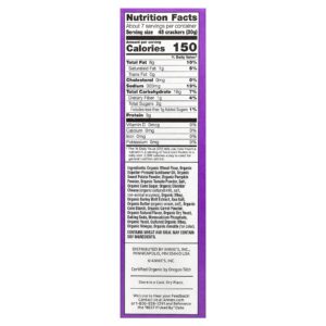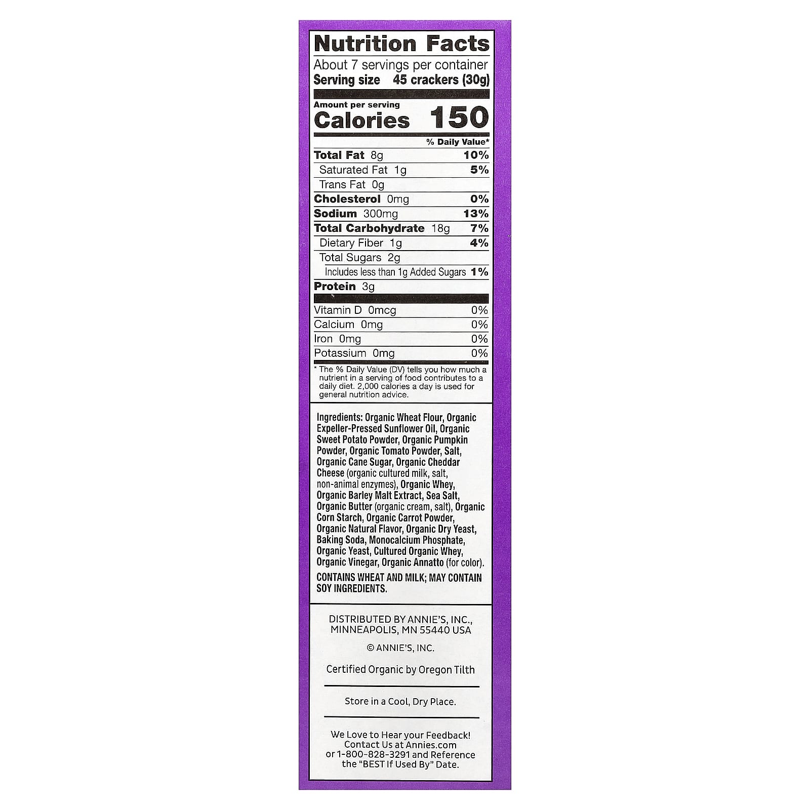 Farinha de trigo orgânica, óleo de girassol extraído em prensa orgânico, batata-doce orgânica em pó, pó de abóbora orgânica, tomate orgânico em pó, sal, açúcar de cana orgânico, queijo cheddar orgânico (leite de cultura orgânico, sal, enzimas não animais), whey orgânico, extrato de malte de cevada orgânico, sal marinho, manteiga orgânica (creme orgânico, sal), amido de milho orgânico, pó de cenoura orgânica, sabor natural orgânico, fermento seco orgânico, bicarbonato de sódio, monofosfato de cálcio, fermento orgânico, whey fermentado orgânico, vinagre orgânico, anato orgânico (para dar cor).