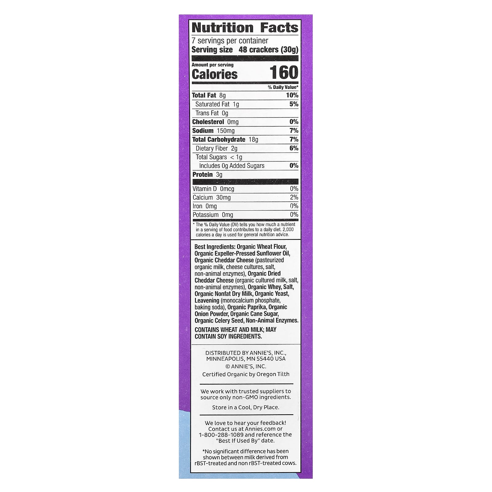 Farinha de trigo orgânica, óleo de girassol extraído em prensa orgânico, queijo cheddar orgânico (leite orgânico pasteurizado, culturas de queijo, sal, enzimas não animais), queijo cheddar desidratado orgânico (leite de cultura orgânico, sal, enzimas não animais), whey orgânico, sal, leite desidratado sem gordura (desnatado) orgânico, fermento orgânico, fermentação (fosfato de cálcio monobásico, bicarbonato de sódio), páprica orgânica, pó de cebola orgânica, açúcar de cana orgânico, semente de aipo orgânico, enzimas não animais.