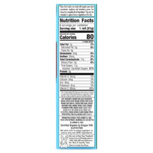 Suco concentrado de pera orgânica, xarope de tapioca orgânica, sólidos de xarope de tapioca orgânica, óleo de girassol orgânico, açúcar de cana orgânica, purê de framboesa orgânica, amido de tapioca orgânica, purê de morango orgânico, corante orgânica (cenoura orgânica, maçã orgânica, e suco concentrado de groselha negra orgânica), sabor natural orgânico, citrato de sódio, pectina cítrica, ácido cítrico, ácido ascórbico (vitamina C).