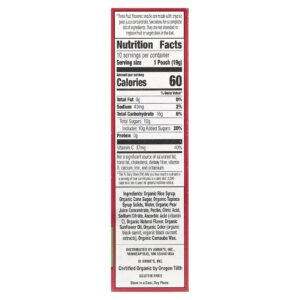 Xarope de arroz orgânico, açúcar de cana orgânico, sólidos de xarope de tapioca orgânica, água, concentrado de suco de pera orgânica, pectina, ácido cítrico, citrato de sódio, ácido ascórbico (vitamina C), sabor natural orgânico, óleo de girassol orgânico, corante orgânico (cenoura preta orgânica, extratos de groselha negra orgânica), cera de carnaúba orgânica.