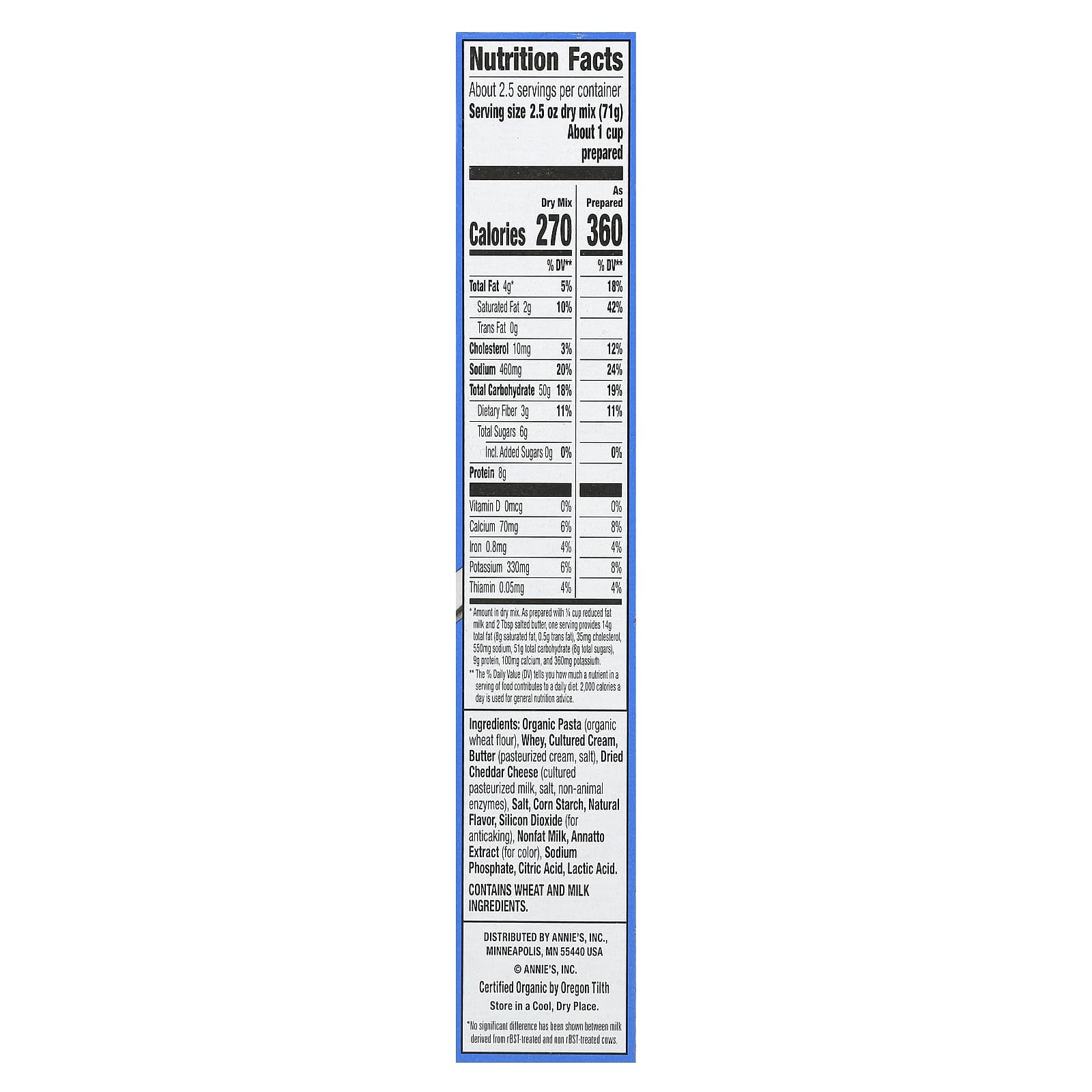 Massa orgânica (farinha de trigo orgânica), whey, creme em cultura, manteiga (creme pasteurizado, sal), queijo cheddar seco (leite pasteurizado em cultura, sal, enzimas não animais), sal, amido de milho, sabor natural, dióxido de silício (como antiaglomerante), leite desnatado, extrato de anato (para cor), fosfato de sódio, ácido cítrico, ácido láctico.