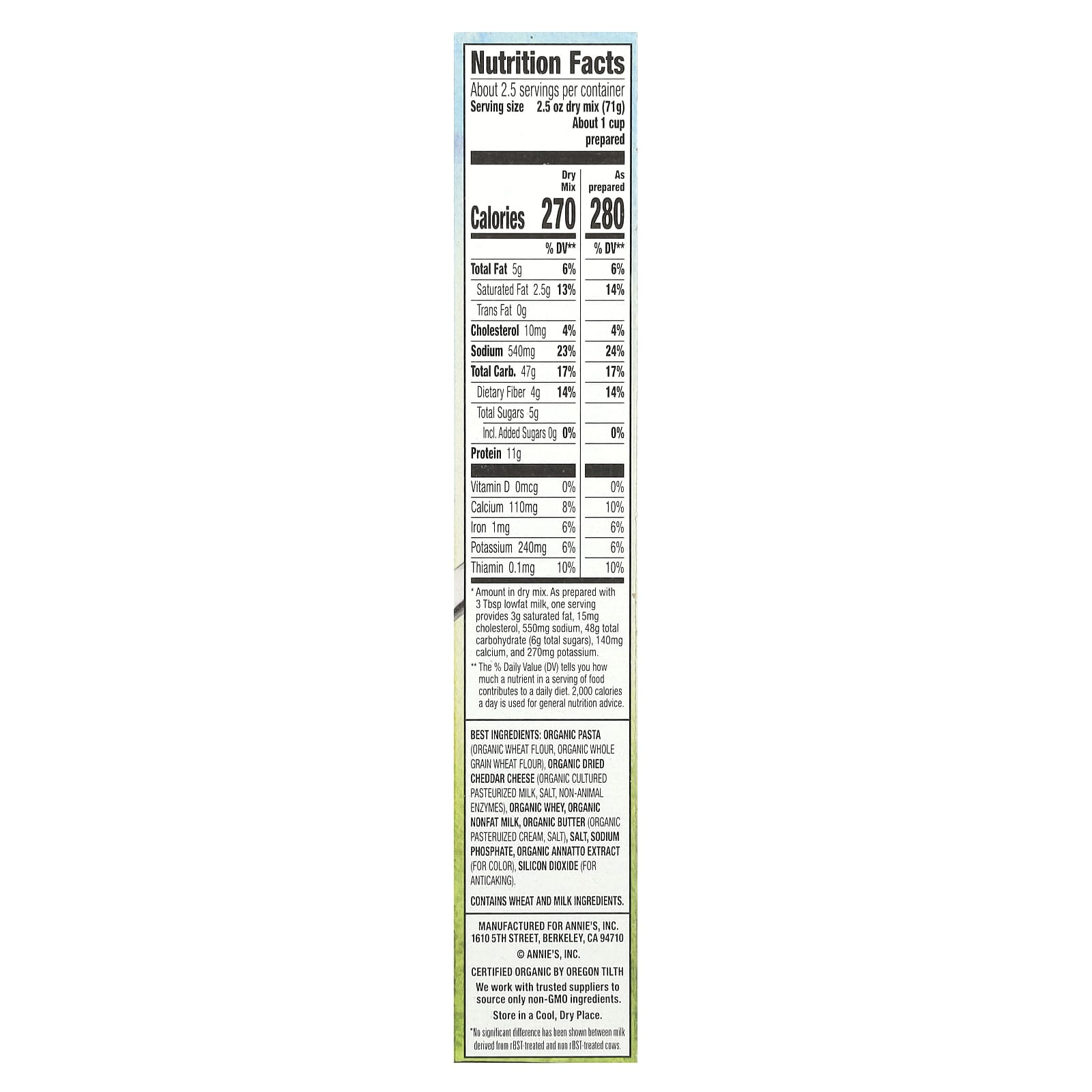 Massa orgânica (farinha de trigo orgânica, farinha de trigo integral orgânica), queijo cheddar seco orgânico (leite pasteurizado de cultura orgânica, sal, enzimas não animais), whey orgânico, leite desnatado orgânico, manteiga orgânica (creme pasteurizado orgânico, sal), sal, fosfato de sódio, extrato de urucum orgânico (para dar cor), dióxido de silício (para antiaglutinante).