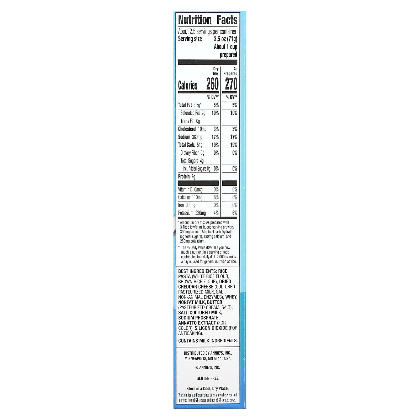 Massa de arroz (farinha de arroz branco, farinha de arroz integral), queijo cheddar seco (leite pasteurizado em cultura, sal, enzimas não animais), whey, leite desnatado, manteiga (creme pasteurizado, sal), sal, leite de cultura, fosfato de sódio, extrato de anato (para cor), dióxido de silício (para antiaglutinante).