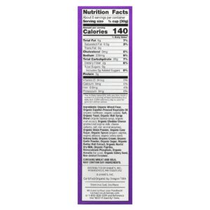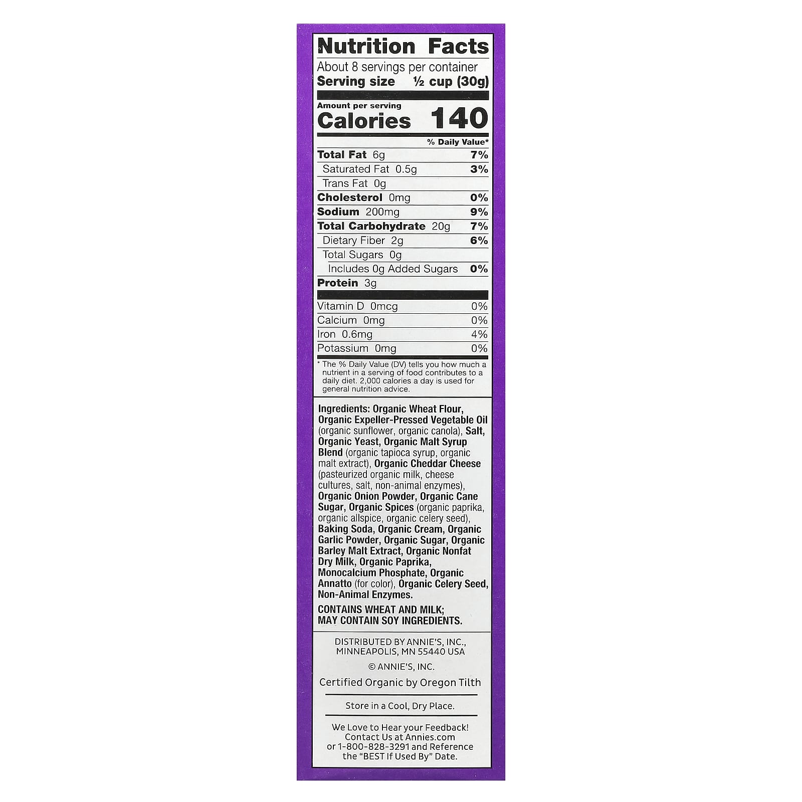 Farinha de trigo orgânica, óleo vegetal extraído em prensa orgânico (girassol orgânico, canola orgânica), sal, fermento orgânico, mistura de xarope de malte orgânico (xarope de tapioca orgânica, extrato de malte orgânico), queijo cheddar orgânico (leite orgânico pasteurizado, culturas de queijo, sal, enzimas não animais), pó de cebola orgânica, açúcar de cana orgânico, especiarias orgânicas (páprica orgânica, pimenta-da-jamaica orgânica, semente de aipo orgânico), bicarbonato de sódio, creme orgânico, pó de alho orgânico, açúcar orgânico, extrato de malte de cevada orgânico, leite desidratado sem gordura (desnatado) orgânico, páprica orgânica, monofosfato de cálcio, anato orgânico (corante), semente de aipo orgânico, enzimas não animais.