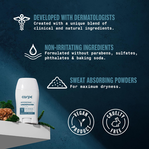 Carpe – EFICÁCIA OTIMIZADA: A solução de força clínica recomendada pelo dermatologista para transpiração excessiva. Nosso antitranspirante e desodorante foram projetados especificamente para parar o suor nas axilas e ajudar a controlar os sintomas da hiperidrose. Trabalhe para não suar nada, restaure a confiança e aproveite a vida com axilas secas e frescas!