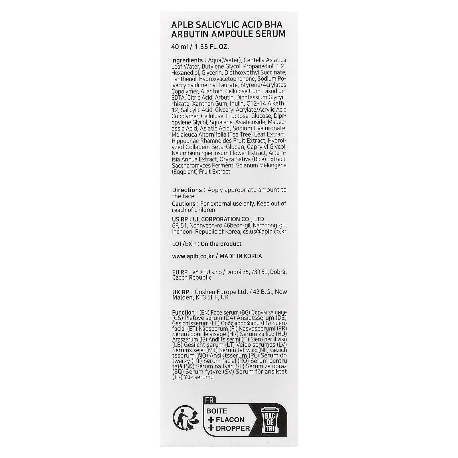 APLB Sérum de Ampola de Arbutina BHA de Ácido Salicílico 40 ml (135 fl oz) – APLB Beleza Tratamentos e Séruns Séruns Faciais Séruns Hidratantes Séruns hidratantes K-Beauty.