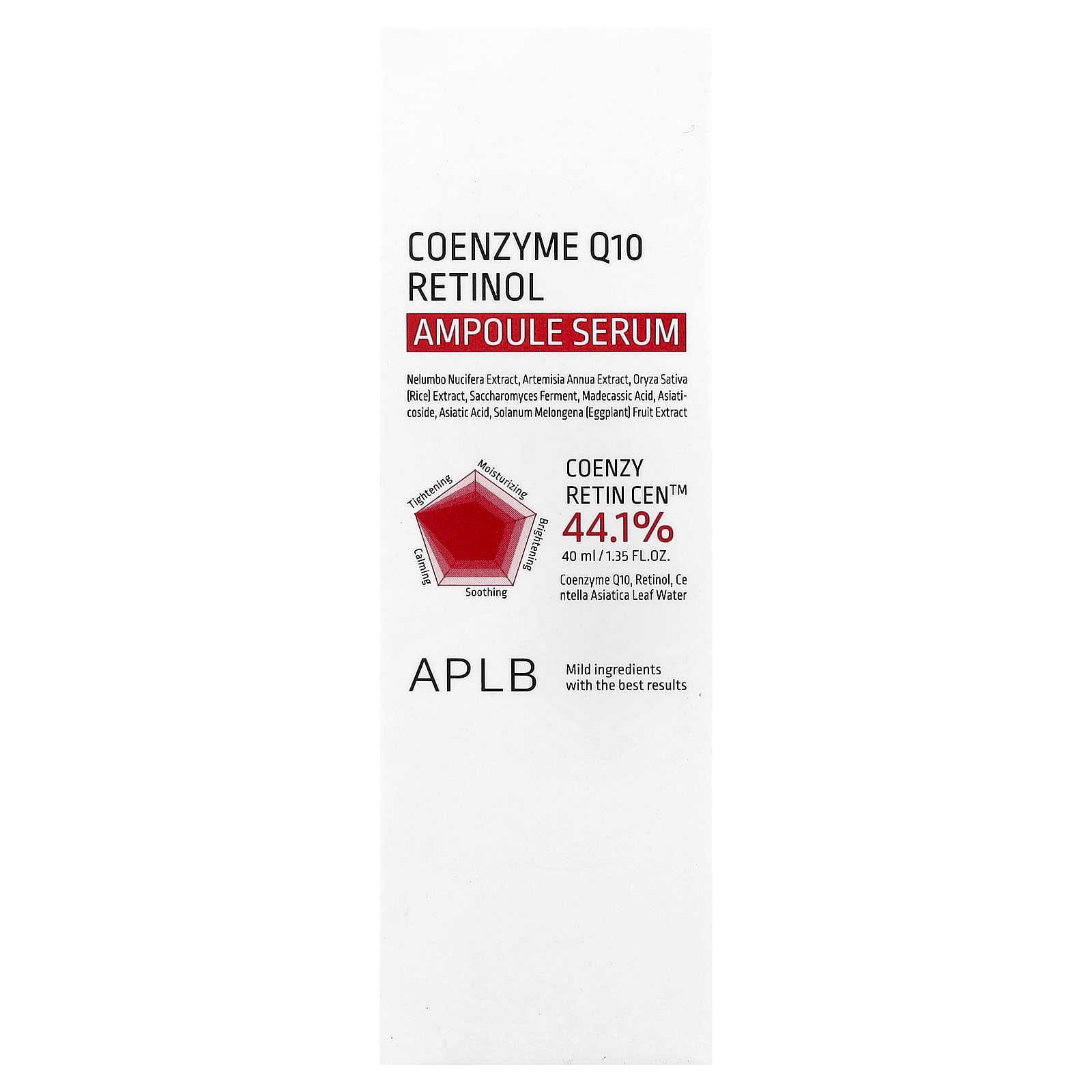 Água, água da folha de Centella asiatica (44,1%), butilenoglicol, propanediol, glicerina, succinato de dietoxietil, ubiquinona (1.000 ppb), retinol (1.000 ppb), óleo de Glycine soja (soja), bht, ácido madecássico, asiaticosídeo, asiatic acid, esqualano, extrato da fruta de Solanum melongena (berinjela), extrato da folha de Melaleuca alternifolia (melaleuca), betaglucano, extrato da fruta de Hippophae rhamnoides, extrato de Nelumbo nucifera, extrato de Artemisia annua, extrato de Oryza sativa (arroz), fermento de Saccharomyces, dimetildietilenoglicol, citrato de sódio, hialuronato de sódio, alantoína, trideceth-10, goma de celulose, edetato dissódico, glyceryl acrylate/acrylic acid copolymer, ácido cítrico, goma xantana, inulina, celulose, glicose, frutose, ethylhexylglycerin, hydroxyacetophenone, sodium polyacryloyldimethyl taurate, dipotassium glycyrrhizate, 1,2-hexanediol.