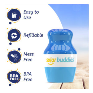 Apresentamos o inovador aplicador de esponja roll-on recarregável Solar Buddies, um divisor de águas na proteção solar para crianças, adultos e famílias em qualquer lugar. Com seu design exclusivo, este aplicador permite um processo de aplicação de protetor solar limpo, eficiente e divertido, tornando-o um sucesso entre pais e filhos. O recurso recarregável garante que você possa usar qualquer protetor solar ou loção adequada ao tipo de pele da sua família, proporcionando flexibilidade e uso contínuo. O design fácil de usar, incluindo uma bola rolante e um sistema de esponja, facilita a aplicação do protetor solar, eliminando a bagunça e o desperdício comumente associados à aplicação do protetor solar. Perfeitamente dimensionado para viagens, este aplicador compacto se encaixa perfeitamente em qualquer bagagem de mão, pronto para proteger sua pele onde quer que você esteja. O aplicador foi projetado para durar, com peças recicláveis e cabeças de esponja substituíveis que mantêm nosso compromisso com a sustentabilidade. Apresentado em programas de prestígio como Dragons' Den da BBC, Buy It Now do Channel 4 e The Today Show, e homenageado com vários prêmios por inovação, o aplicador Solar Buddies é a maneira mais inteligente e limpa de se manter protegido contra o sol. Revolucione sua rotina de proteção solar com o Solar Buddies e junte-se às inúmeras famílias que transformaram a aplicação de protetor solar de uma tarefa em uma delícia. – VERSÁTIL E RECARREGÁVEL: Projetado para versatilidade, este aplicador de protetor solar para crianças está vazio, permitindo que você o preencha com o protetor solar que melhor se adapta ao seu tipo de pele. É facilmente limpo e reutilizável, oferecendo uma opção sustentável de proteção solar. – APLICAÇÃO ADEQUADA PARA CRIANÇAS E SEM BAGUNÇA: diga adeus às aplicações de protetor solar bagunçadas. Este aplicador de rolo de protetor solar foi projetado para ser simples, facilitando o uso das crianças. Preencha-o com o protetor solar escolhido, agite e aplique. A bola rolante garante uma distribuição uniforme, enquanto a esponja auxilia na aplicação suave. – Tamanho perfeito para viagem: de tamanho perfeito para uso em qualquer lugar, ela comporta 100 ml ou 3,4 fl oz, cabendo confortavelmente em sua bagagem de mão. Um indicador de 100 ml claramente marcado sob o gargalo amarelo da garrafa ajuda você a permanecer dentro dos limites de bagagem de mão líquida. O aplicador de protetor solar recarregável Solar Buddies é essencial para viagens de crianças! – CABEÇAS SUBSTITUÍVEIS: estenda a vida útil do aplicador de protetor solar em rolo simplesmente substituindo as cabeças da esponja em vez da unidade inteira. Essa opção de design não apenas economiza dinheiro, mas também apóia os esforços de reciclagem (remova a esponja antes de reciclar). Todas as peças, incluindo a tampa, foram projetadas para serem guardadas e reutilizadas. – INOVAÇÃO PREMIADA: apresentada no Dragons' Den da BBC, no Buy It Now, no Channel 4, no This Morning, no The Gadget Show, no The Weather Channel e no Today Show. A Solar Buddies ganhou vários prêmios por sua abordagem inovadora na aplicação de protetor solar e seu sucesso no mercado de varejo.