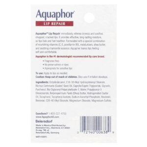 O Lip Repair da Aquaphor® alivia imediatamente o ressecamento e ameniza os lábios rachados e ressecados. Fornece uma hidratação eficaz e duradoura para que os lábios fiquem com aparência e sensação mais saudáveis. Formulado com uma combinação especial de vitaminas nutritivas (C, E e pró-vitamina B5), hidratantes, manteiga de karité e essência de camomila calmante, o Aquaphor proporciona uma sensação de maciez e conforto para os lábios.